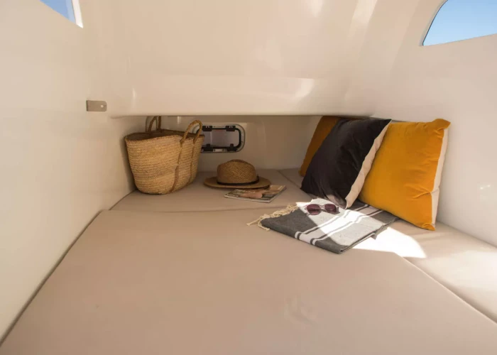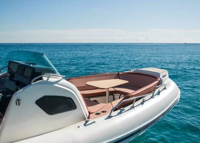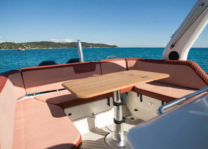 A spacious relaxation area for unforgettable days on the water. Double bow and rear U-Lounge, convertible to a sundeck area. Up to 14 seats in standard equipment, integrated kitchen with sink (optional : grill), console integrating a habitable cabin with toilets (optional : bunk bed space). Triple position bolster for up to two adults + one child. Rear bathing platforms giving access to the sea.
